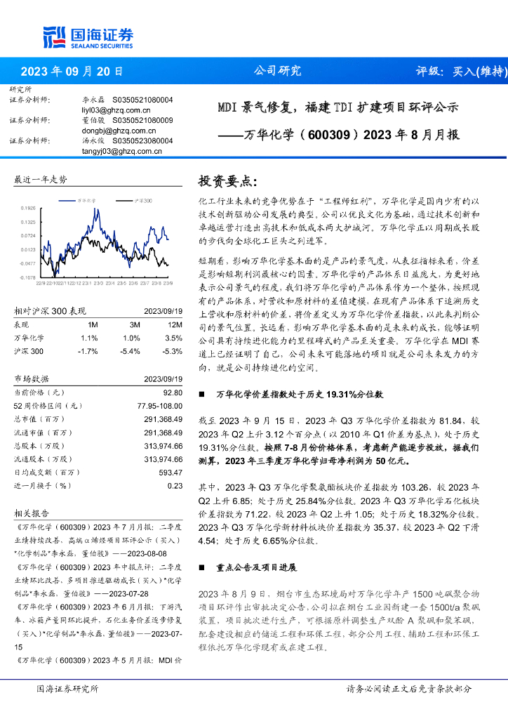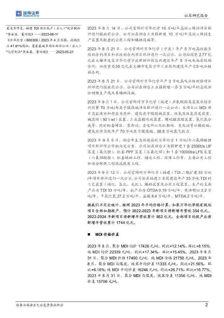 国海证券:万华化学(600309)-2023年8月月报:MDI景气修复,福建TDI扩建项目环评公示.pdf