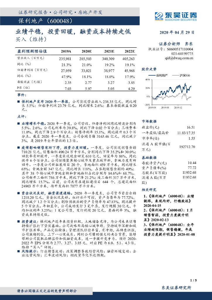 东吴证券:保利地产(600048)-业绩平稳,投资回暖,融资成本持续走低.pdf