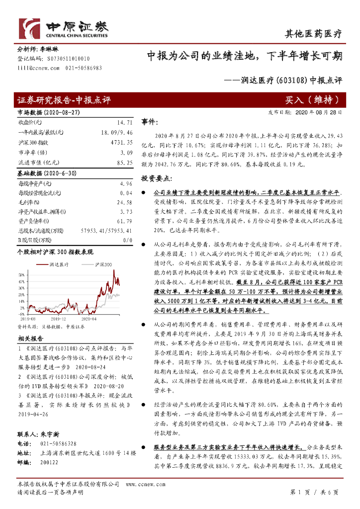 中原证券:润达医疗(603108)-中报点评:中报为公司的业绩洼地,下半年增长可期.pdf
