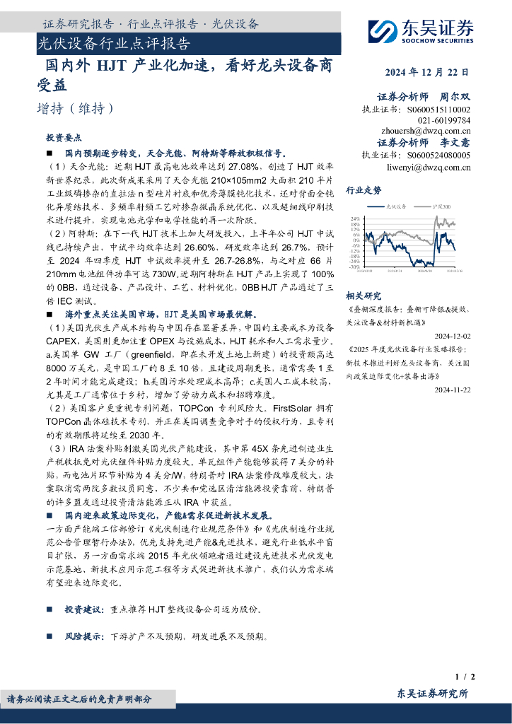 东吴证券:光伏设备行业点评报告:国内外HJT产业化加速,看好龙头设备商受益.pdf