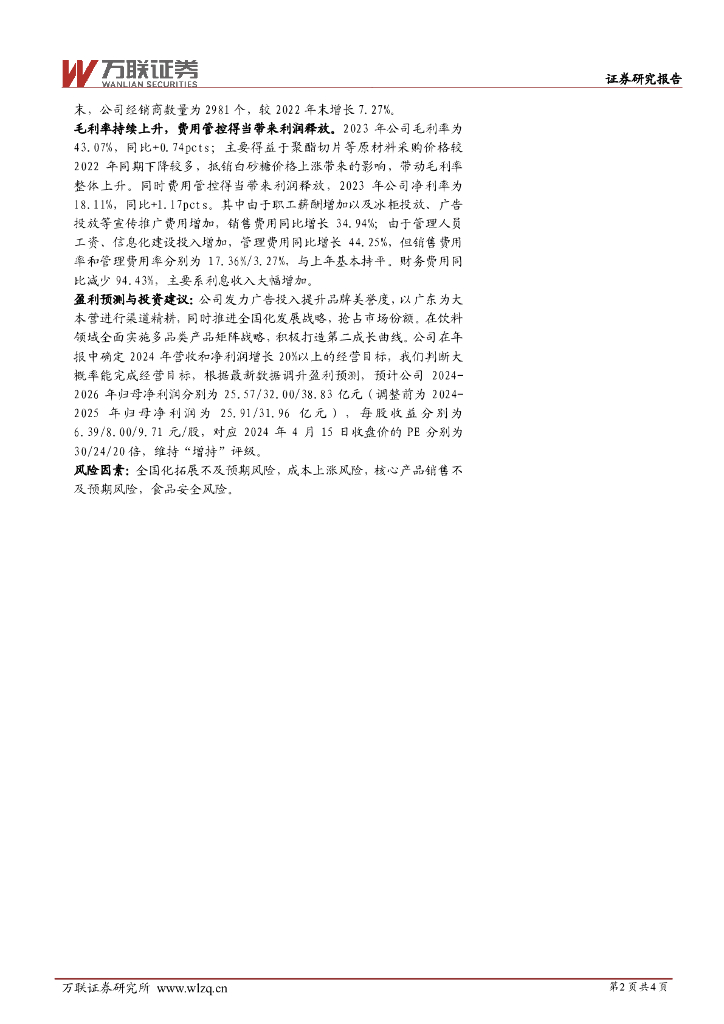 万联证券:东鹏饮料(605499)-2023年业绩点评报告:营业收入突破百亿,第二曲线表现亮眼.pdf