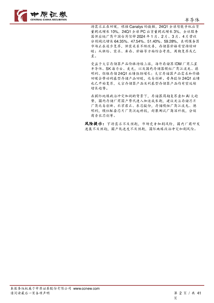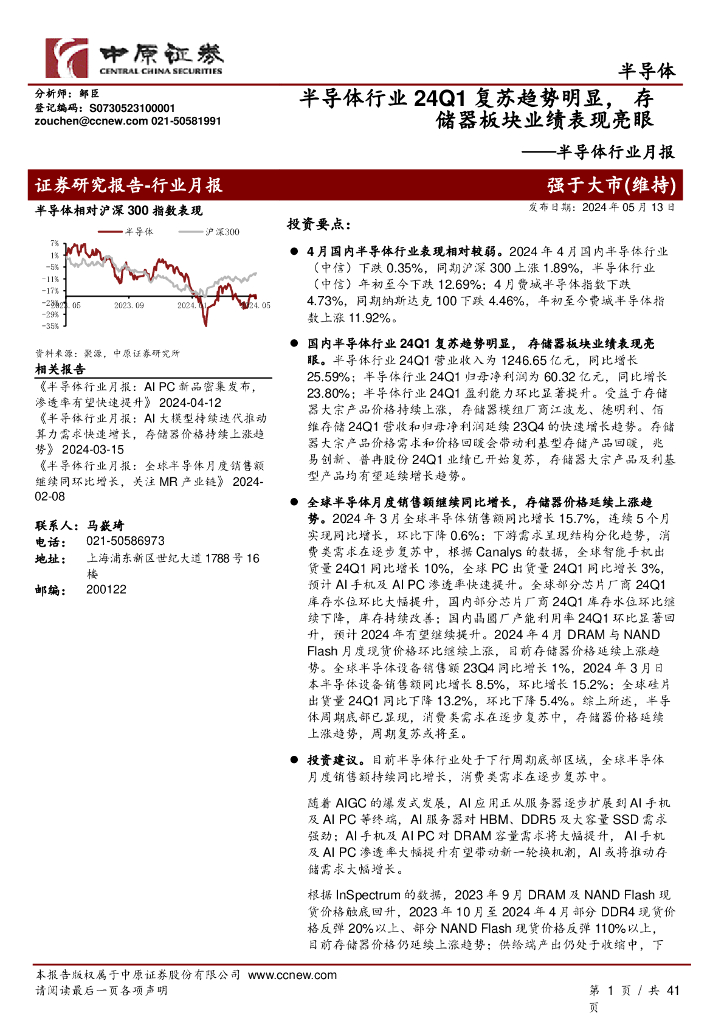 中原证券:半导体行业月报:半导体行业24Q1复苏趋势明显,存储器板块业绩表现亮眼.pdf
