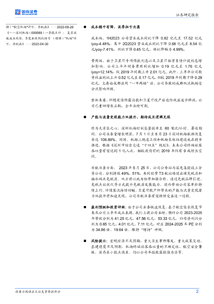 国海证券:深圳机场(000089)-2023年半年报点评:经营拾级而上,二季度盈利0.53亿元.pdf
