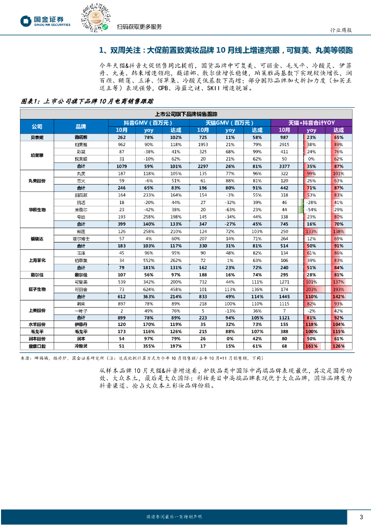 国金证券:化妆品与日化行业研究周报:大促前置致美妆品牌10月线上增速亮眼,可复美、丸美等领跑.pdf