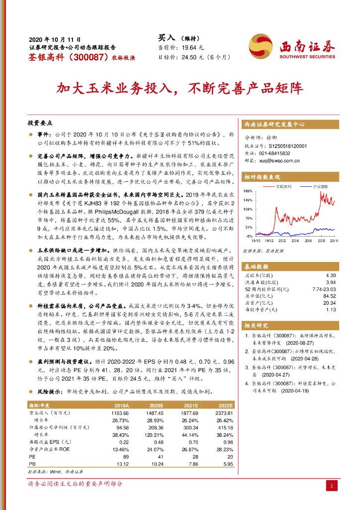 西南证券:荃银高科(300087)-加大玉米业务投入,不断完善产品矩阵.pdf