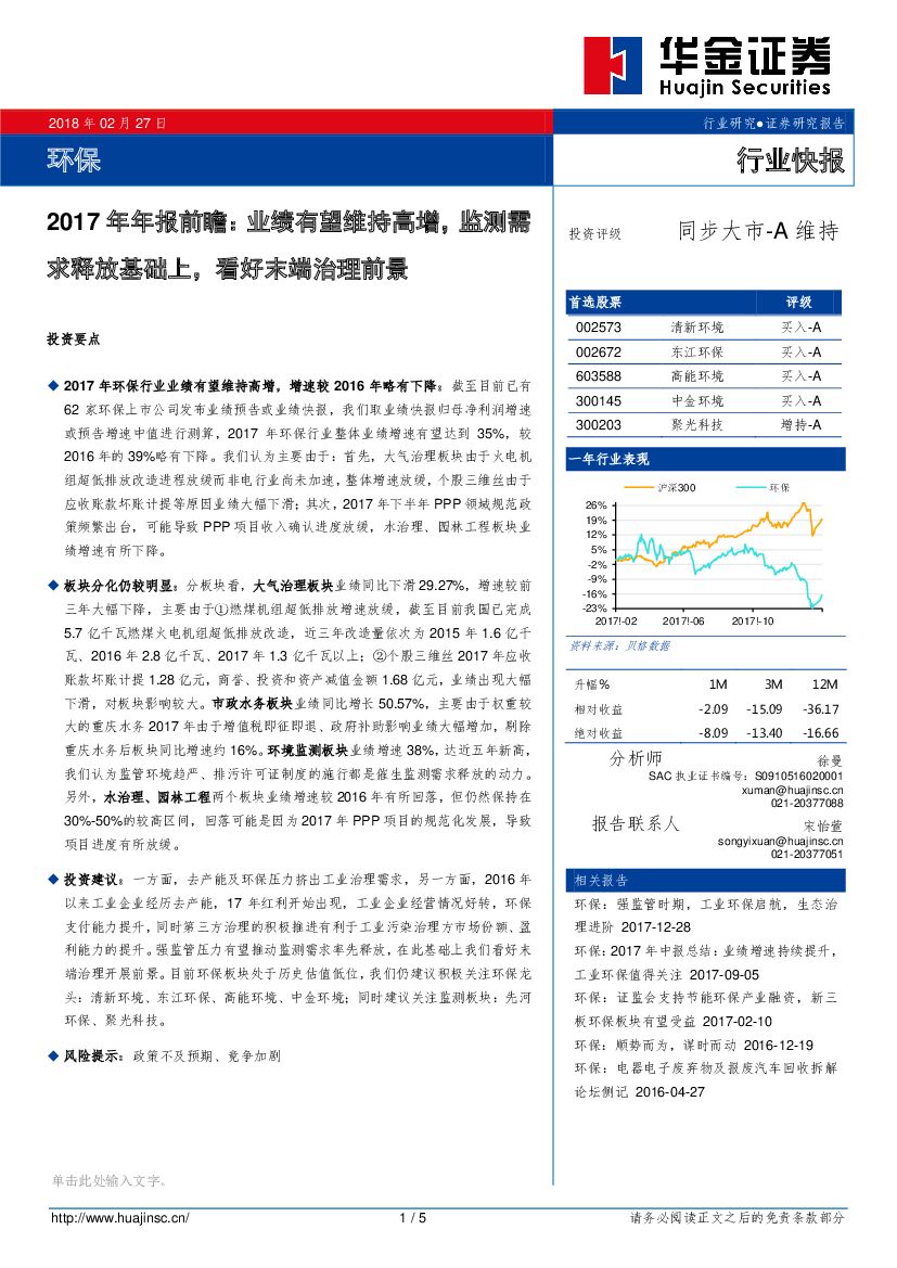 华金证券:环保2017年年报前瞻:业绩有望维持高增,监测需求释放基础上,看好末端治理前景.pdf