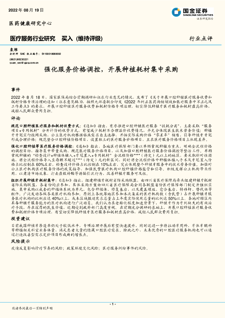 国金证券:医疗服务行业研究:强化服务价格调控,开展种植耗材集中采购.pdf
