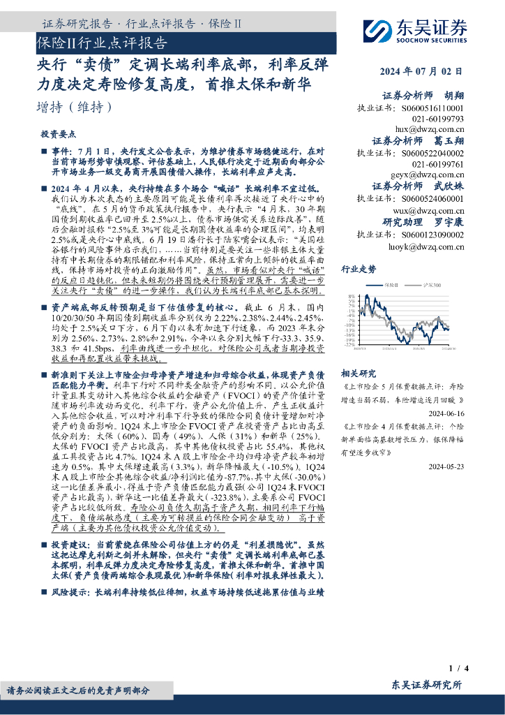 东吴证券:保险Ⅱ行业点评报告:央行“卖债”定调长端利率底部,利率反弹力度决定寿险修复高度,首推太保和新华.pdf