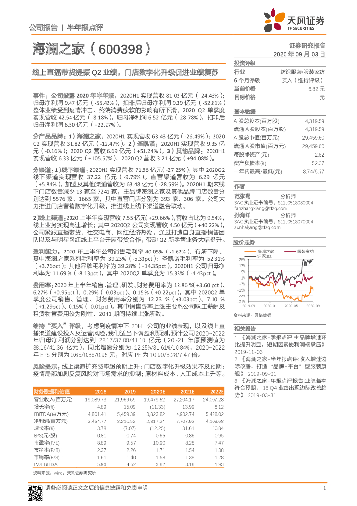 天风证券:海澜之家(600398)-线上直播带货提振Q2业绩,门店数字化升级促进业绩复苏.pdf