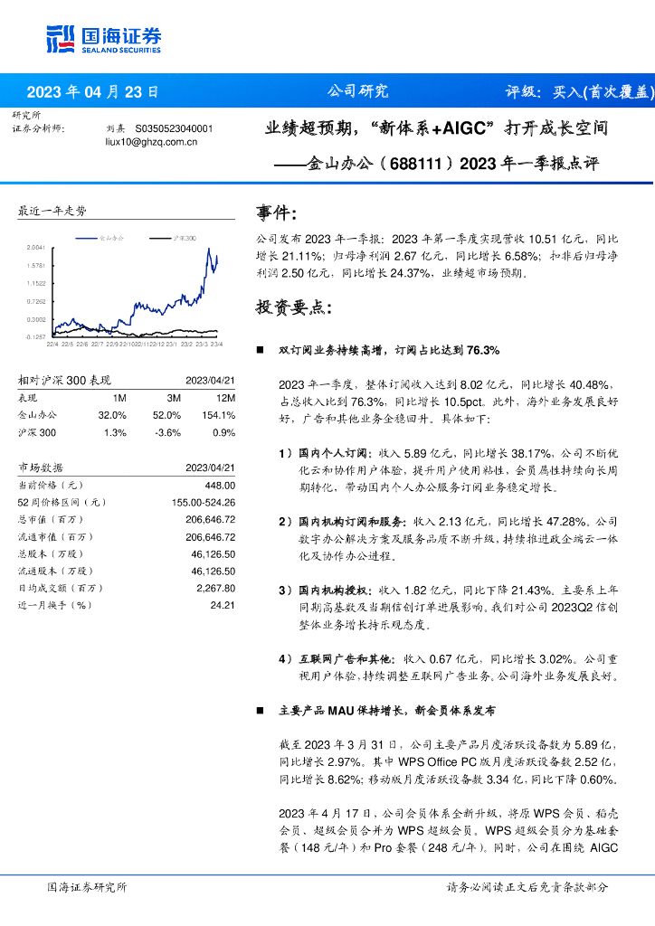 国海证券:金山办公(688111)-2023年一季报点评:业绩超预期,“新体系+AIGC”打开成长空间.pdf