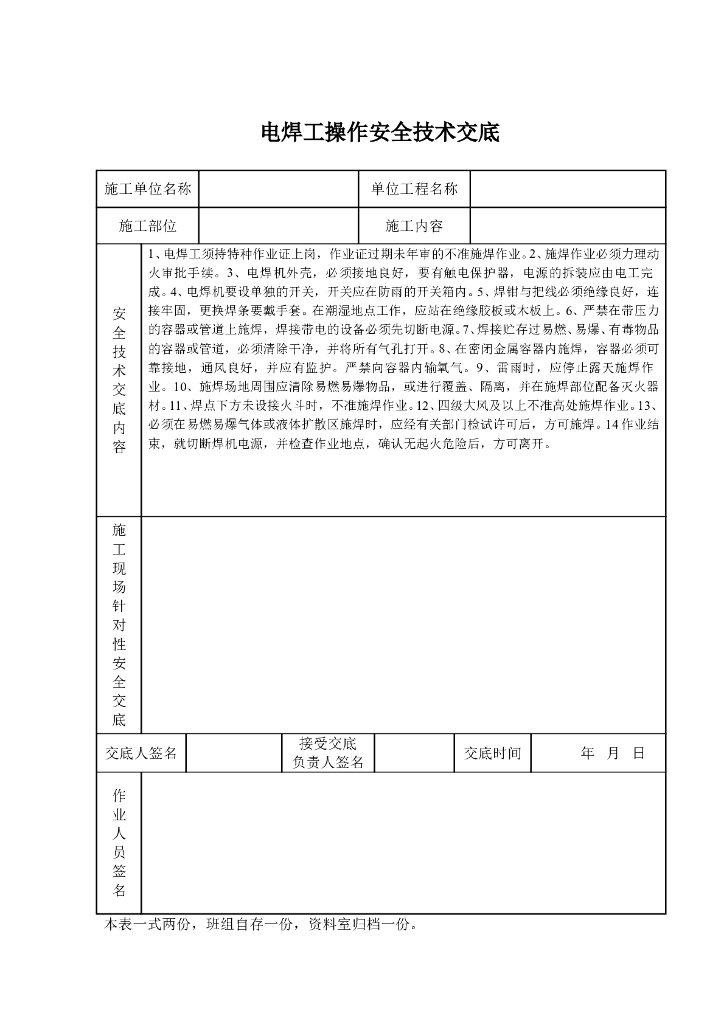 电焊操作安全技术交底表格.doc