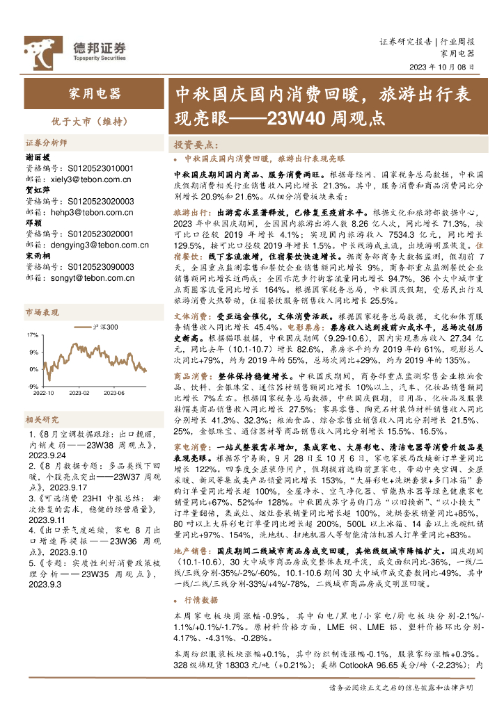 德邦证券:家用电器23W40周观点:中秋国庆国内消费回暖,旅游出行表现亮眼.pdf