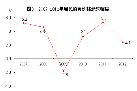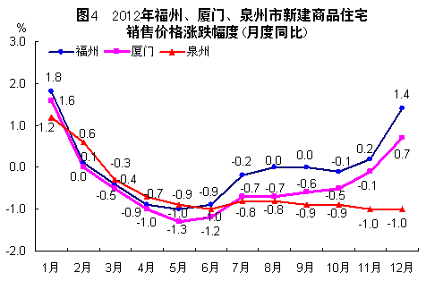 全年居民消费价格比上年上涨2.4%,其中食品价格上涨4.6%。商品零售价格上涨1.8%。固定资产投资价格上涨0.3%。工业生产者出厂价格下降1.3%。工业生产者购进价格下降2.3%。农产品生产价格上涨2.7%。农业生产资料价格上涨3.3%。福州市新建商品住宅价格与上年比持平,厦门市、泉州市分别下跌0.4%、0.5%。
