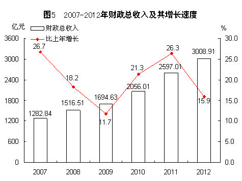全年公共财政总收入3008.91亿元,比上年增长15.9%,其中,地方公共财政收入1776.21亿元,增长18.3%;公共财政支出2601.08亿元,增长18.3%。全省国税税收收入(含海关代征)1919.5亿元,增长14.5%;全省地税系统组织各项收入1821.61亿元,增长15.7%。
