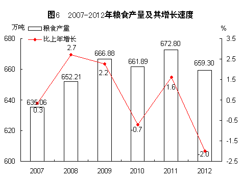全年粮食产量659.30万吨,比上年减产13.50万吨,下降2.0%。其中,稻谷产量503.78万吨,减产10.37万吨,下降2.0%。