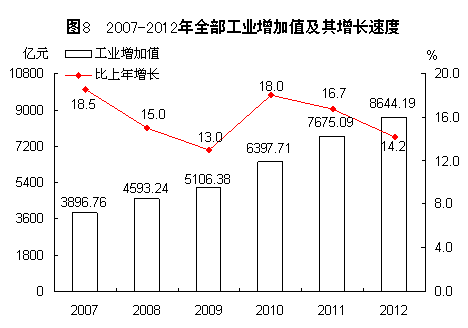 全年全部工业实现增加值8644.19亿元,比上年增长14.2%,其中规模以上工业增加值7856.29亿元,增长15.2%。工业产品销售率97.77%,比上年回落0.30个百分点。