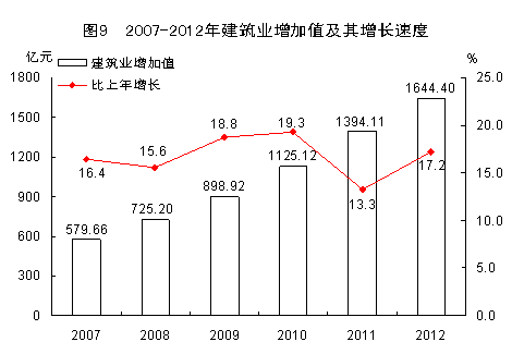 全年全社会建筑业实现增加值1644.40亿元,比上年增长17.2%。全省具有资质等级的总承包和专业承包建筑业企业完成建筑业总产值4399.93亿元,增长19.2%;实现利润150.53亿元,增长19.2%;税金总额158.18亿元,增长19.2%。