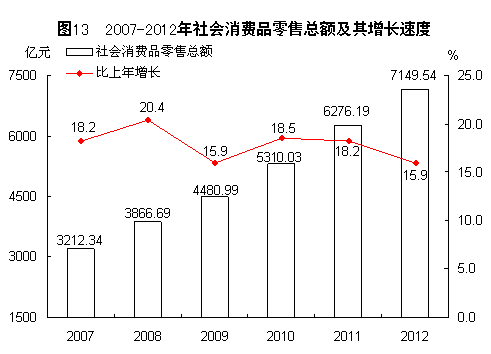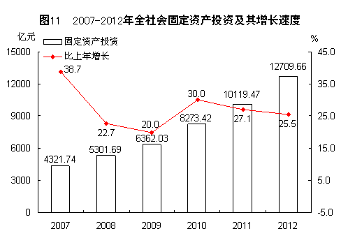 全年全社会固定资产投资12709.66亿元,比上年增长25.5%。其中,固定资产投资(不含农户)12452.24亿元,增长25.9%;农户投资257.42亿元,增长10.1%。