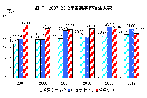 全年全日制研究生教育招生1.19万人,在学全日制研究生3.60万人,毕业生1万人。普通高等教育招生21.35万人,在校生70.14万人,毕业生17.85万人。非师范类高校毕业生就业率为92%。各类中等职业教育(不含技工校)招生24.08万人,在校生58.30万人,毕业生17.59万人。成人高等教育招生4.71万人,在校生11.86万人,毕业生2.93万人。全省普通高中招生21.87万人,在校生69.05万人,毕业生22.56万人。全省普通初中招生38.19万人,在校生112.04万人,毕业生40.48万人。普通小学招生46.75万人,在校生252.73万人,毕业生39.13万人。特殊教育在校生2.73万人。幼儿园在园幼儿139.98万人。