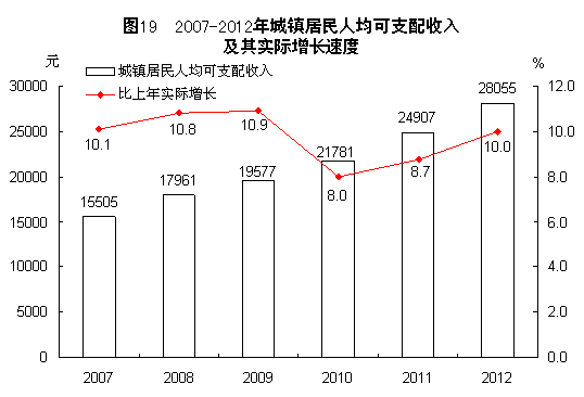 全年农民人均纯收入9967元,比上年增长13.5%;扣除价格因素,实际增长10.8%。城镇居民人均可支配收入28055元,比上年增长12.6%;扣除价格因素,实际增长10.0%。农村居民食品消费支出占消费总支出的比重为46.0%,城镇为39.4%。