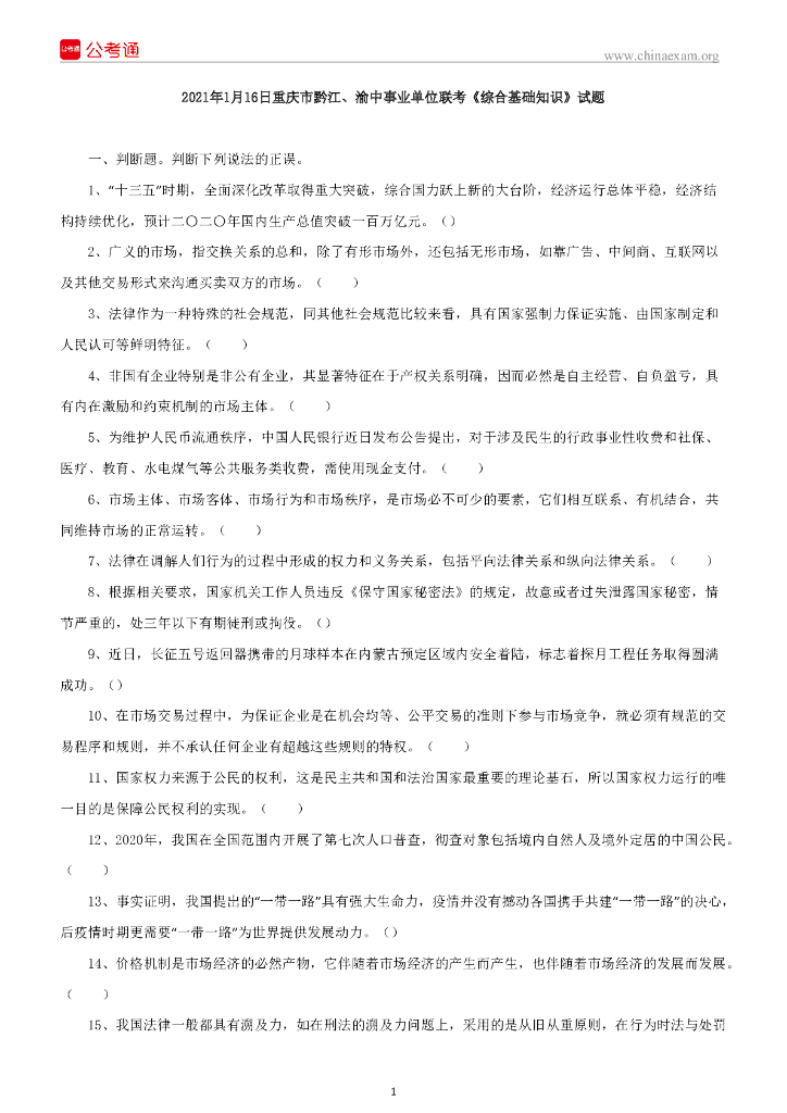 2021年1月16日重庆市黔江、渝中事业单位联考《综合基础知识》试题.pdf