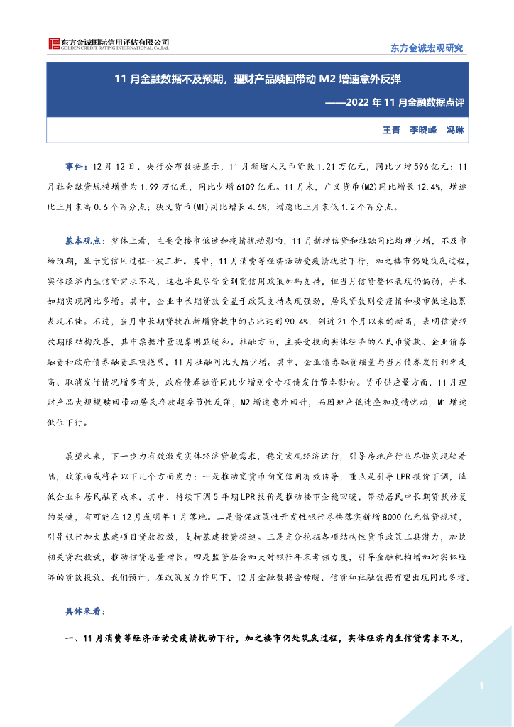 东方金诚: 2022年11月金融数据点评-11月金融数据不及预期,理财产品赎回带动M2增速意外反弹.pdf