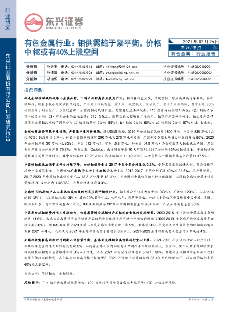 东兴证券:有色金属行业:钼供需趋于紧平衡,价格中枢或有40%上涨空间.pdf