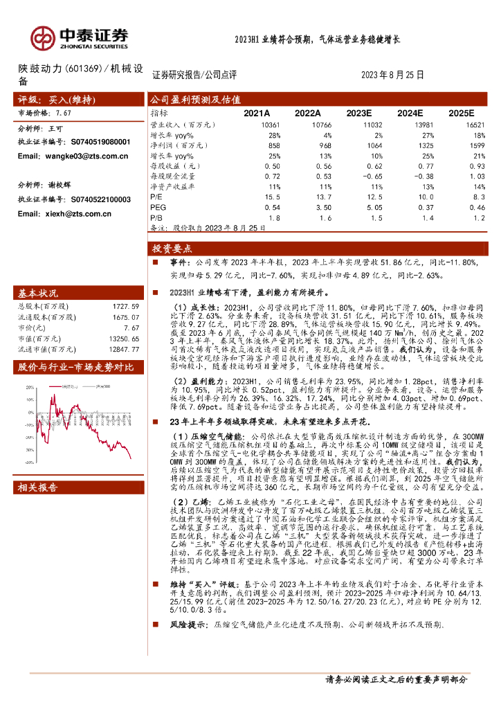 中泰证券:陕鼓动力(601369)-2023H1业绩符合预期,气体运营业务稳健增长.pdf
