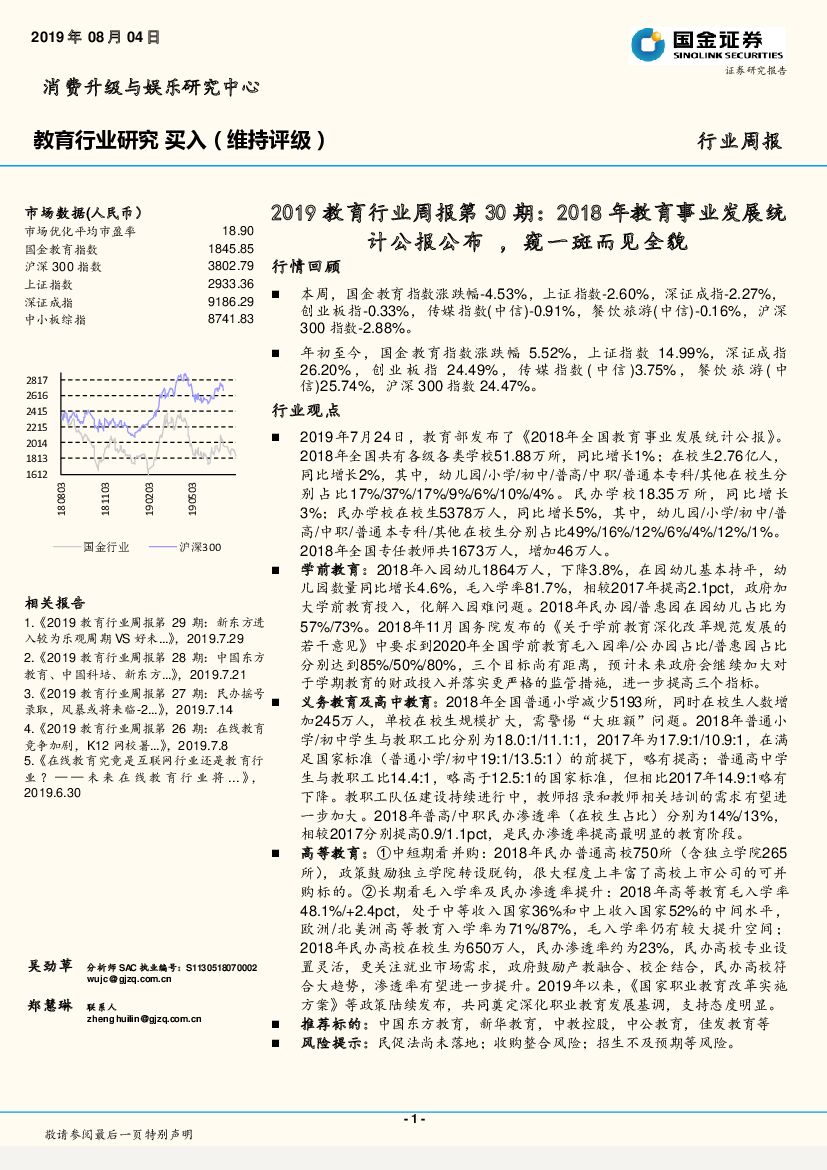 国金证券:2019教育行业周报第30期:2018年教育事业发展统计公报公布,窥一斑而见全貌.pdf