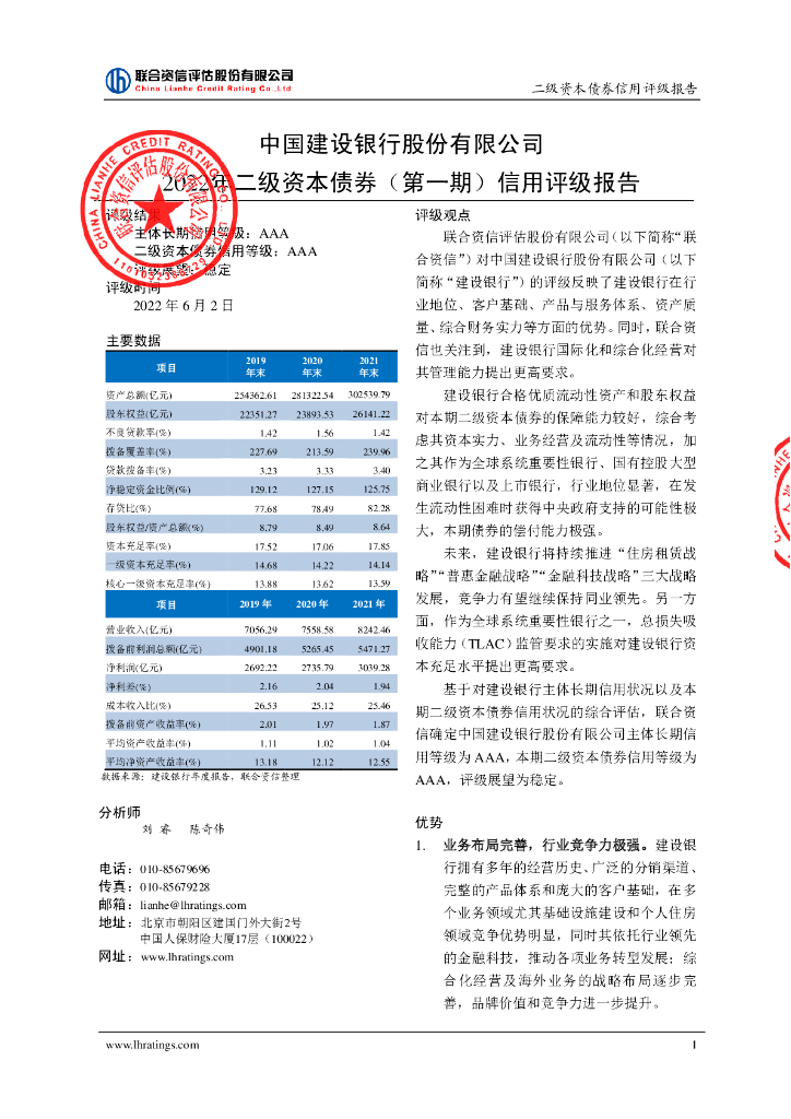 联合资信:中国建设银行股份有限公司2022年二级资本债券(第一期)信用评级报告及跟踪评级安排.pdf