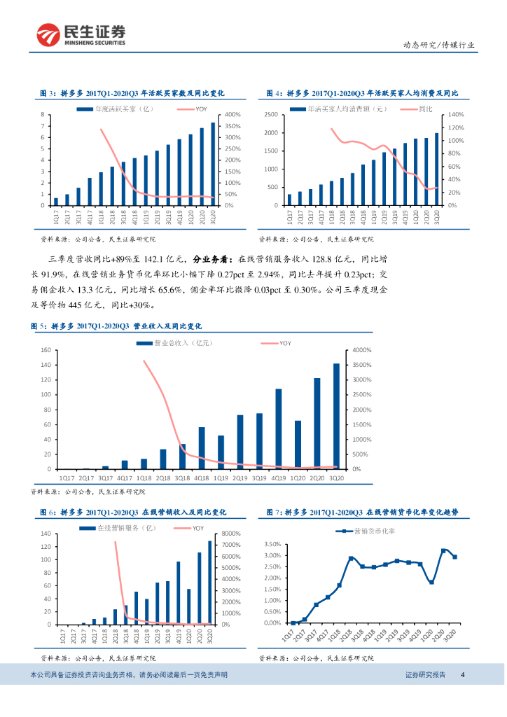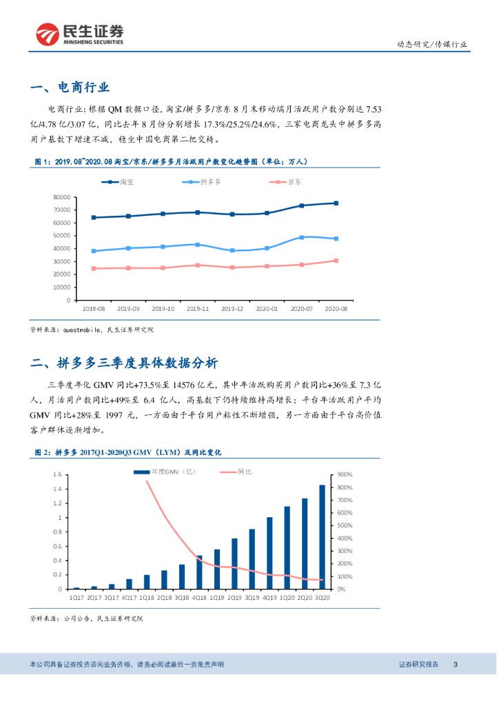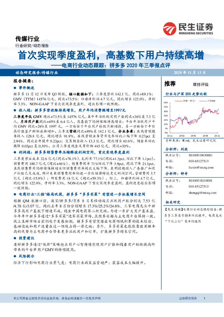 民生证券:电商行业动态跟踪:拼多多2020年三季报点评-首次实现季度盈利,高基数下用户持续高增.pdf