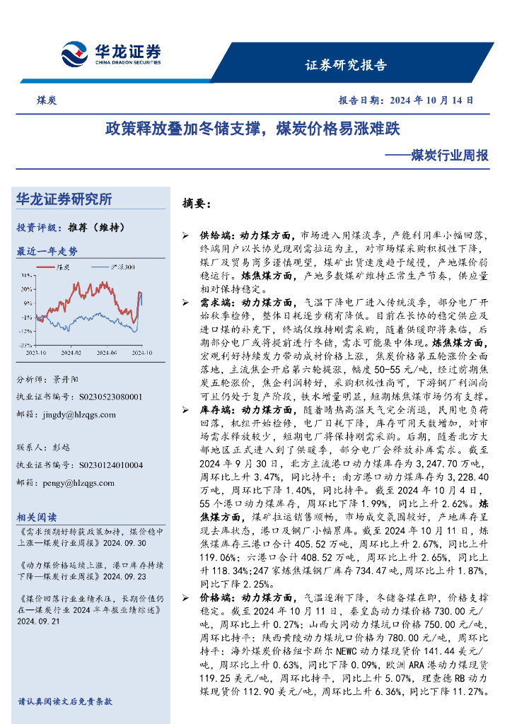 华龙证券:煤炭行业周报:政策释放叠加冬储支撑,煤炭价格易涨难跌.pdf