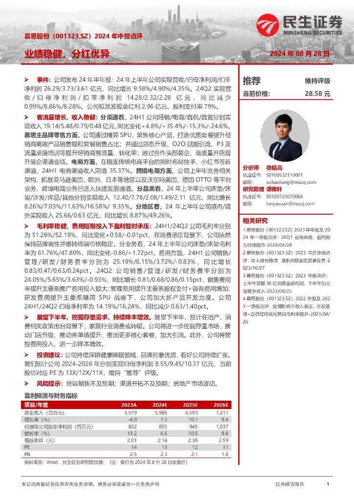民生证券:慕思股份(001323)-2024年中报点评:业绩稳健,分红优异.pdf