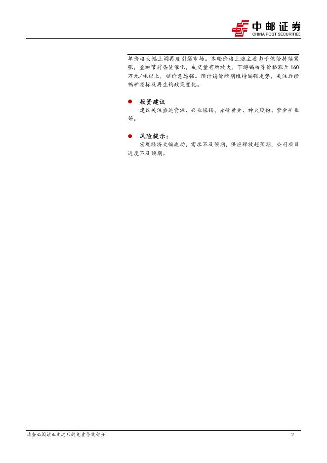 国元证券:有色金属行业双周报:钨价大幅上涨,贵金属短期迎方向选择