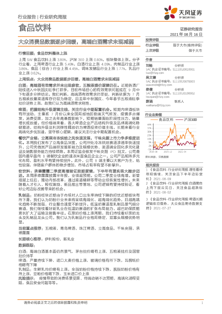 天风证券:食品饮料行业研究周报:大众消费品数据逐步回暖,高端白酒需求未现减弱.pdf