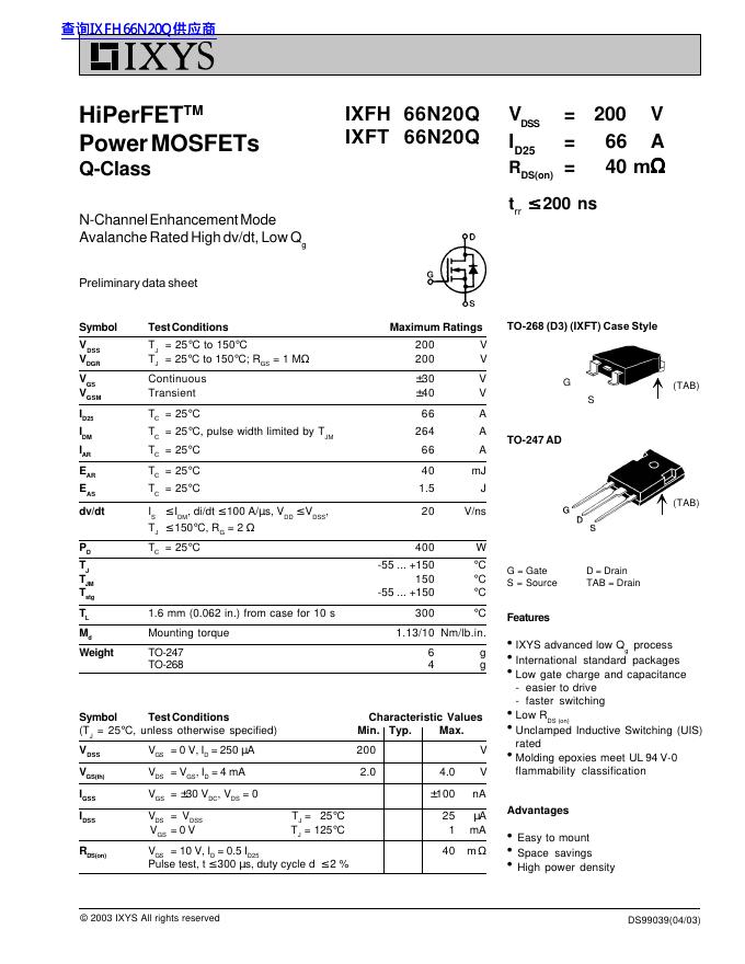 IXYS IXFH 66N20Q IXFT 66N20Q 数据手册.pdf