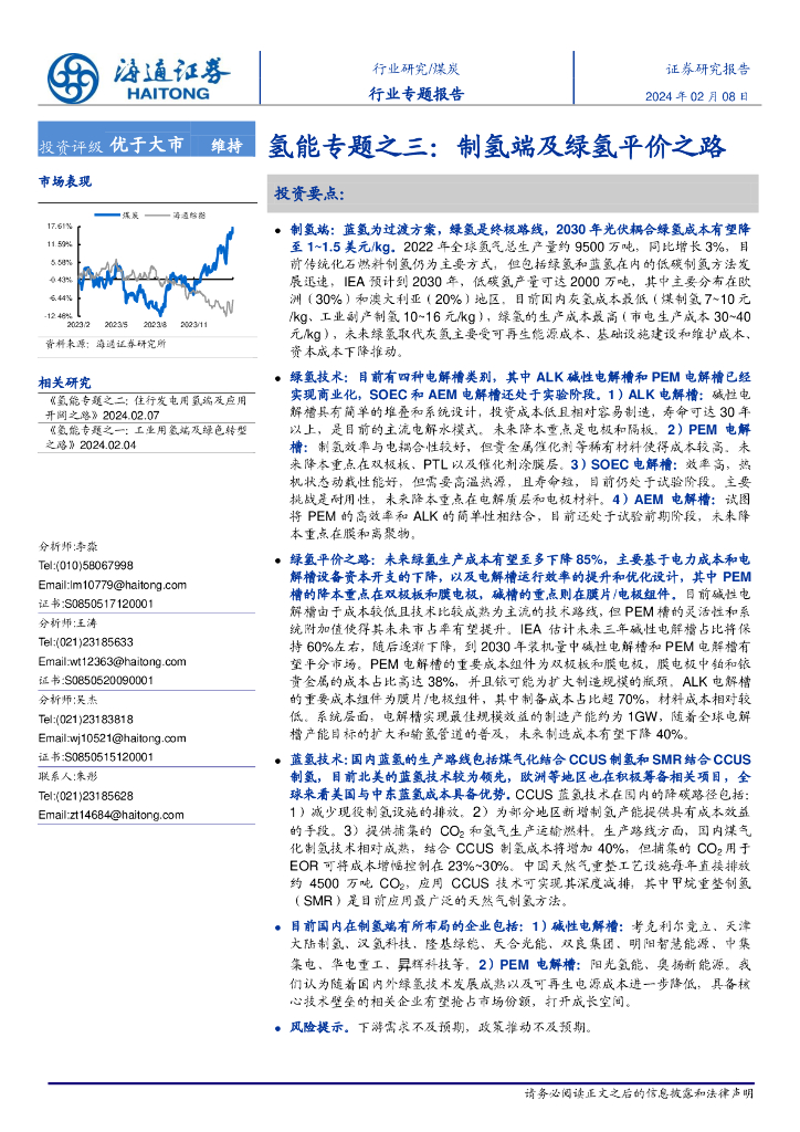 海通证券:氢能专题之三:制氢端及绿氢平价之路.pdf