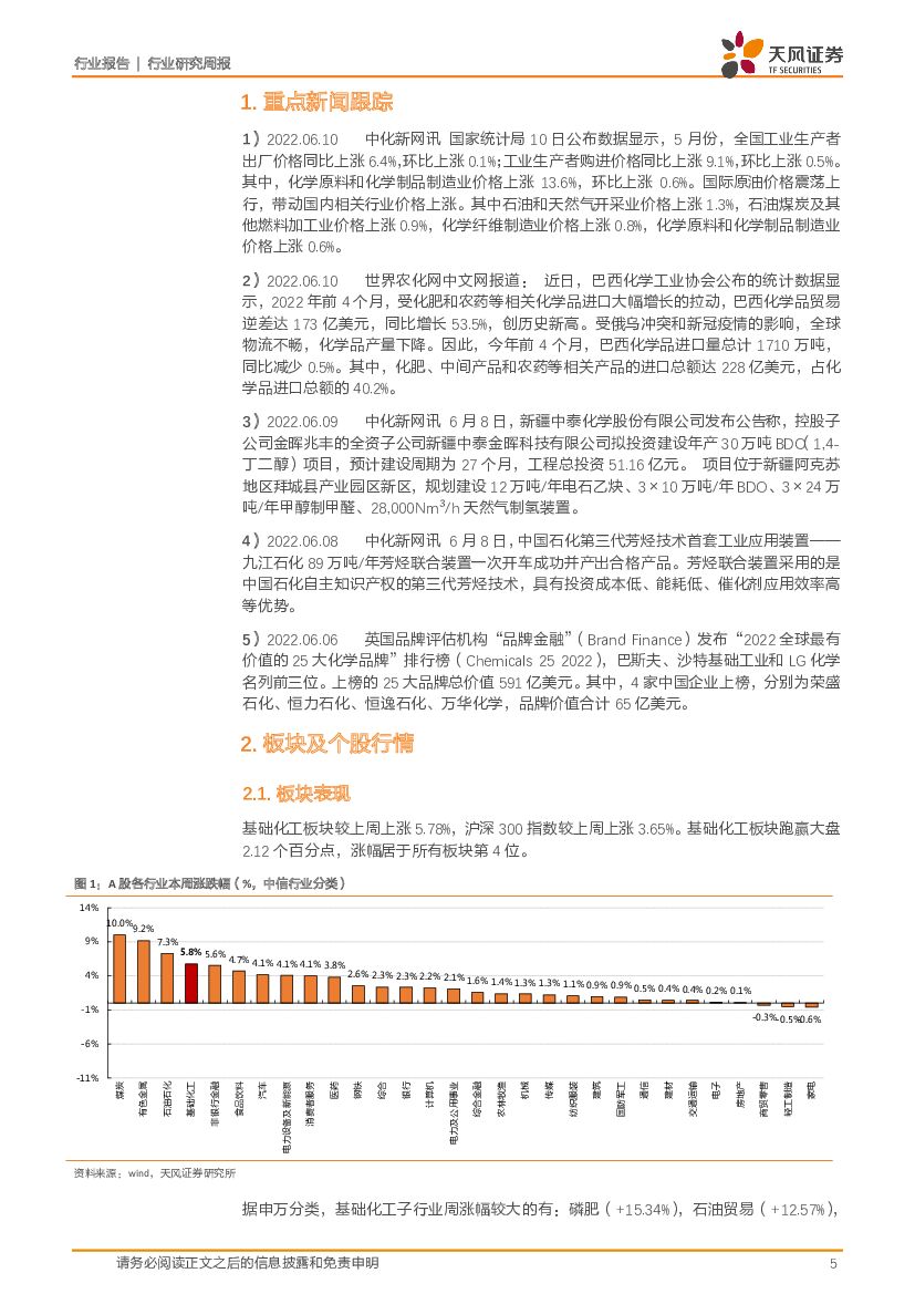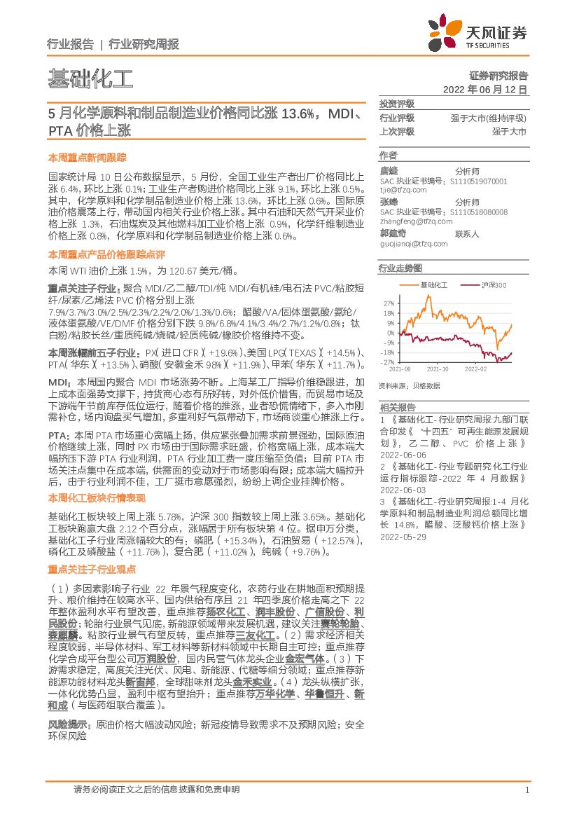 天风证券:基础化工行业研究周报:5月化学原料和制品制造业价格同比涨13.6%,MDI、PTA价格上涨.pdf