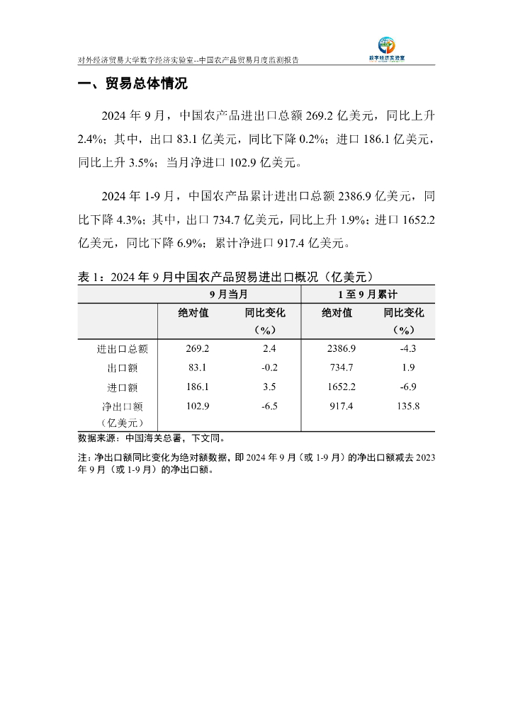 对外经济贸易大学:中国农产品贸易月度监测报告(2024年1-9月).pdf