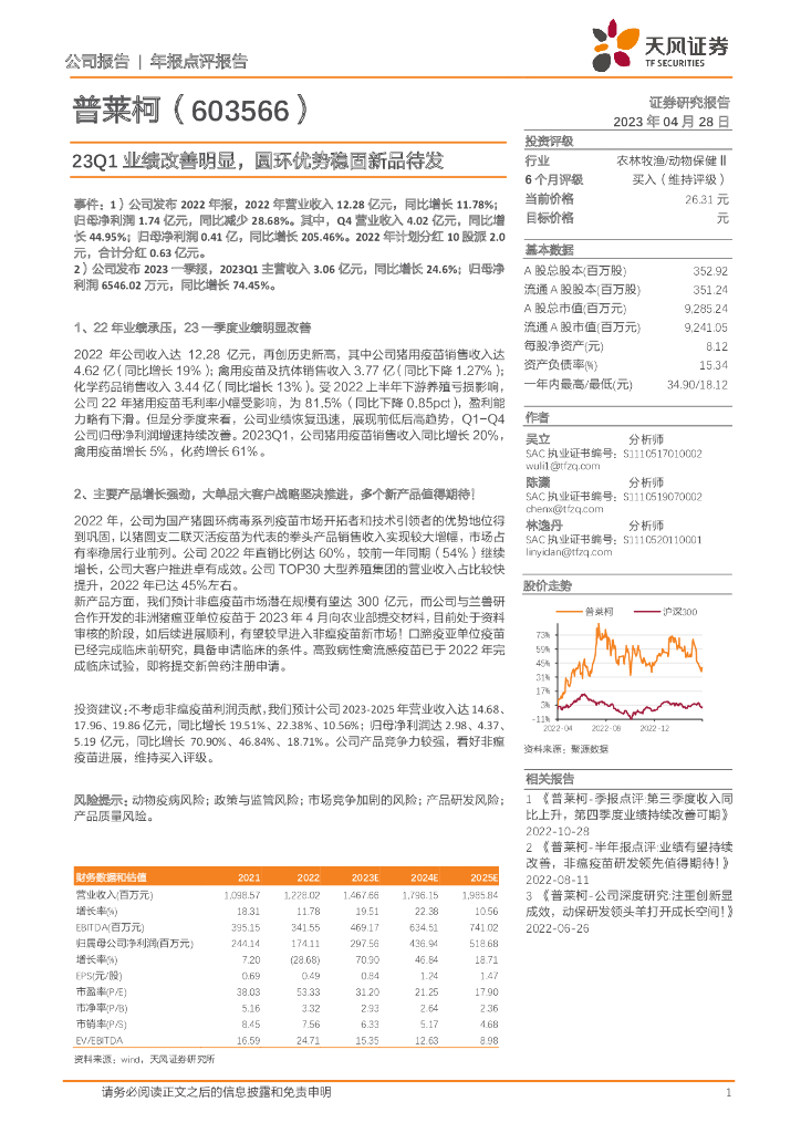 天风证券:普莱柯(603566)-23Q1业绩改善明显,圆环优势稳固新品待发.pdf