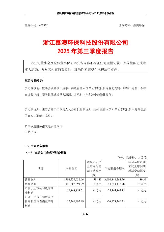 603822-嘉澳环保:2025年第三季度报告.pdf