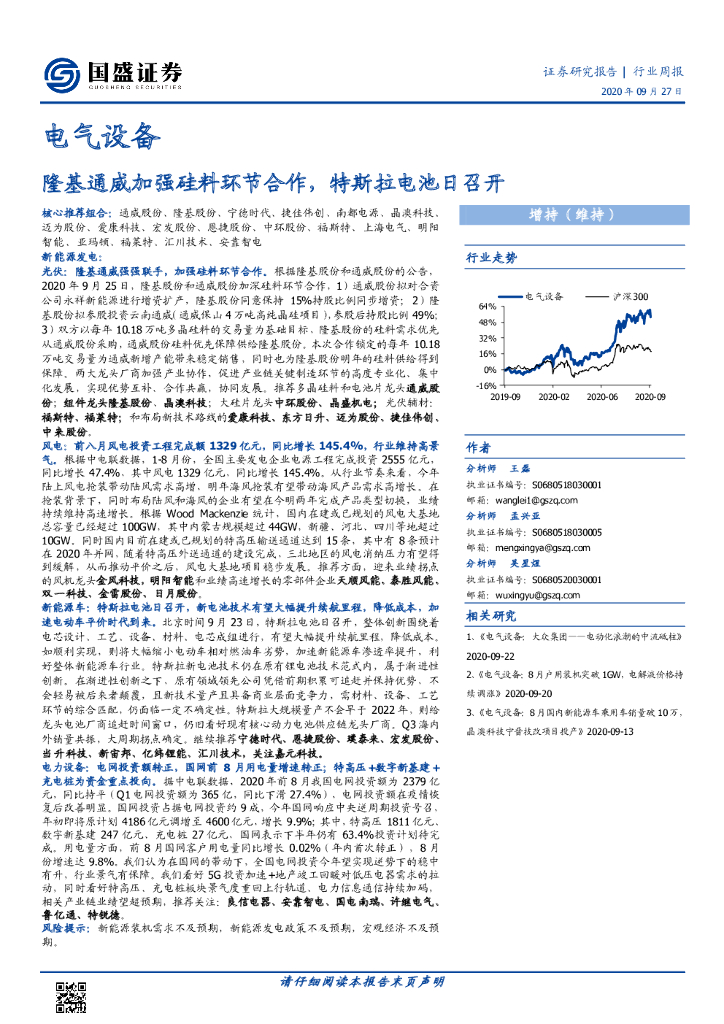 国盛证券:电气设备行业周报:隆基通威加强硅料环节合作,特斯拉电池日召开.pdf