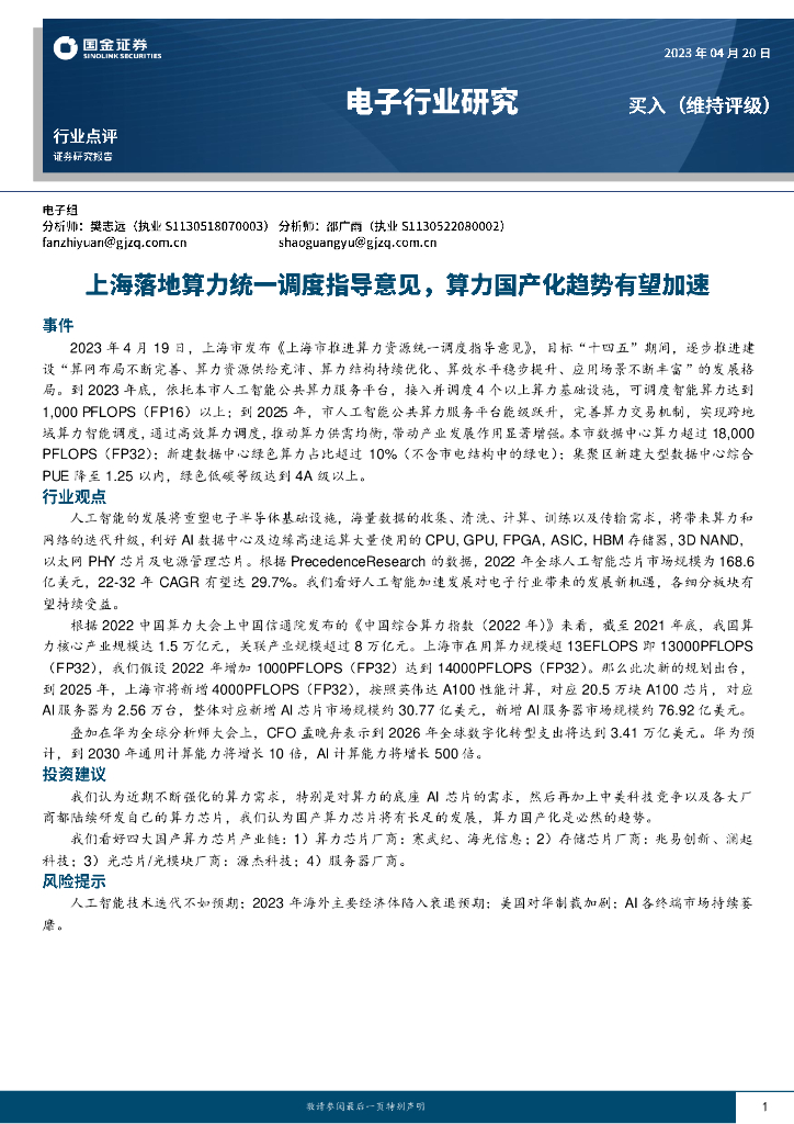 国金证券:电子行业研究:上海落地算力统一调度指导意见,算力国产化趋势有望加速.pdf