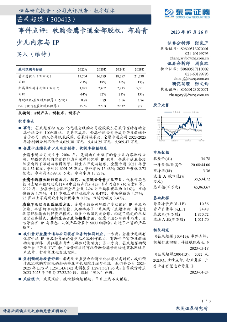 东吴证券:芒果超媒(300413)-事件点评:收购金鹰卡通全部股权,布局青少儿内容与IP.pdf