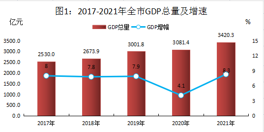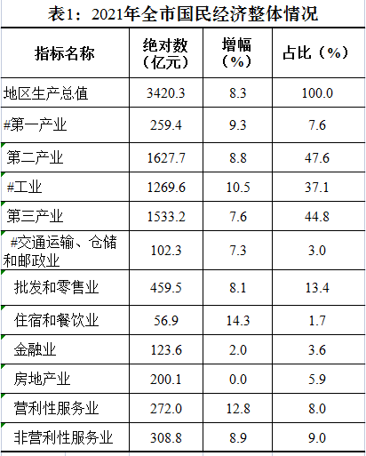 初步核算,全市地区生产总值3420.3亿元,增长8.3%,比2019年增长12.7%,两年平均增长6.2%。其中,第一产业增加值259.4亿元,增长9.3%,两年平均增长6.3%,拉动经济增长0.8个百分点;第二产业增加值1627.7亿元,增长8.8%,两年平均增长6.8%,拉动经济增长4.1个百分点;第三产业增加值1533.2亿元,增长7.6%,两年平均增长5.4%,拉动经济增长3.4个百分点。三次产业结构分别为7.6:47.6:44.8,与上年同期比第一、三产业均下降0.7个百分点,第二产业提升1.4个百分点。第一、二、三产业对GDP增幅的贡献率分别为5.3%、54%和40.7%。全市人均GDP为87852元,增长8.5%,全员劳动生产率为151269元,增长10.4%。