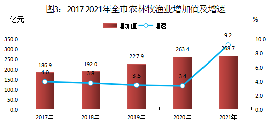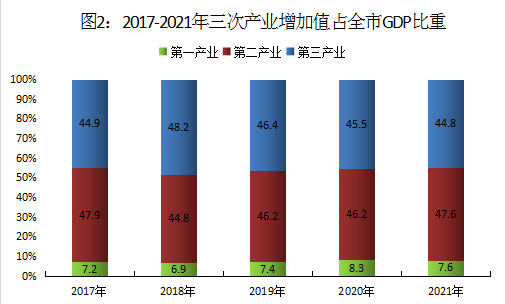 3.根据《国民经济行业分类》(GB/T4754-2017),国家统计局对三次产业划分进行了修订,将“农、林、牧、渔业”中的“农、林、牧、渔专业及辅助性活动”、“采矿业”中的“开采专业及辅助性活动”和“制造业”中的“金属制品、机械和设备修理业”等三个大类调入第三产业,2021年三次产业数据按照此标准进行统计。