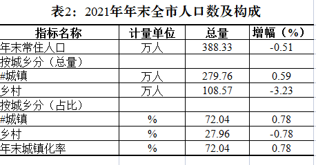 全市年末常住人口388.33万人,较上年减少1.98万人,其中,城镇人口279.76万人,较上年增加1.64万人;乡村人口108.57万人,较上年减少3.62万人;城镇化率为72.04%,较上年提升0.78个百分点。