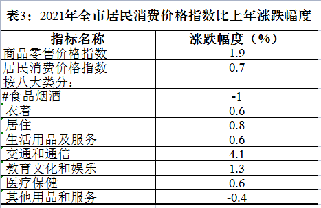 全年居民消费价格比上年上涨0.7%,其中:食品烟酒价格下降1%,衣着价格上涨0.6%,居住价格上涨0.8%,生活用品及服务价格上涨0.6%,交通和通信价格上涨4.1%,教育文化和娱乐价格上涨1.3%,医疗保健价格上涨0.6%,其他用品和服务价格下降0.4%。商品零售价格上涨1.9%。