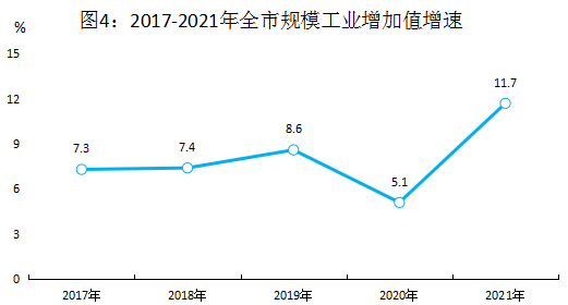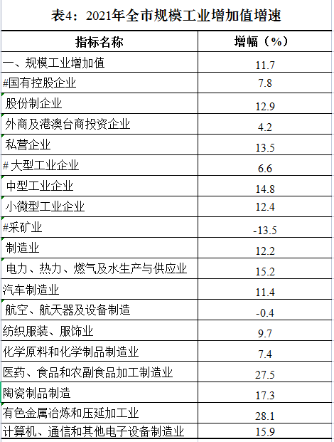 全年规模工业增加值增长11.7%,分经济类型看,国有控股企业增长7.8%,股份制企业增长12.9%,外商及港澳台商投资企业增长4.2%,私营企业增长13.5%;分门类看,采矿业下降13.5%,制造业增长12.2%,电力、热力、燃气及水生产和供应业增长15.2%;分行业看,铁路、船舶、航天航空和其他运输设备制造业增长2.6%,汽车制造业增长11.4%,纺织服装、服饰业增长9.7%,化学原料和化学制品制造业增长7.4%,医药、食品和农副食品加工制造业增长27.5%,陶瓷制品制造业增长17.3%,有色金属冶炼和压延加工业增长28.1%,计算机、通信和其他电子设备制造业增长15.9%。全年规模工业企业营业收入增长13.5%,利润增长12.1%。