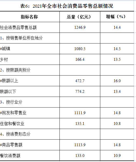 全年社会消费品零售总额1246.9亿元,增长14.4%,两年平均增长5.7%。分经营地看,城镇零售额1080.5亿元,增长14.5%;乡村零售额166.43亿元,增长13.5%。分消费形态看,商品零售额1113.94亿元,增长14.8%,餐饮消费额133亿元,增长10.9%。分行业看,批发和零售业1111.86亿元,增长14.8%,住宿和餐饮业135.07亿元,增长10.8%。分限额类别看,限额以上472.75亿元,增长16%,限额以下774.18亿元,增长13.4%。